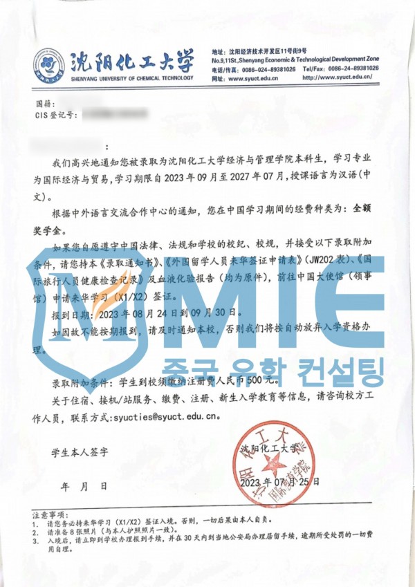 심양화공대학교 > 합격 통지서