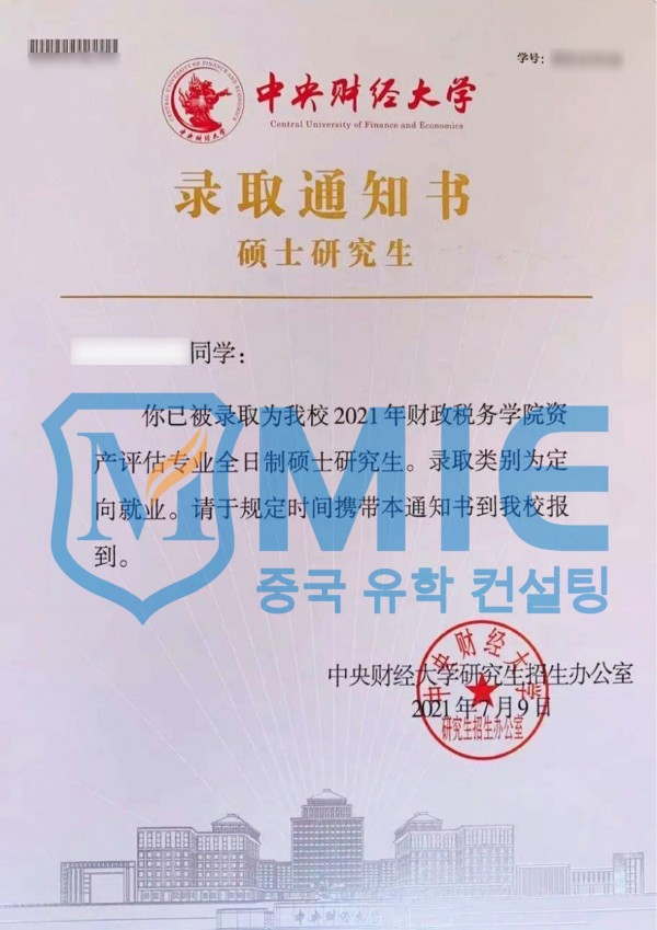 중국재경대학교(211) > 합격 통지서